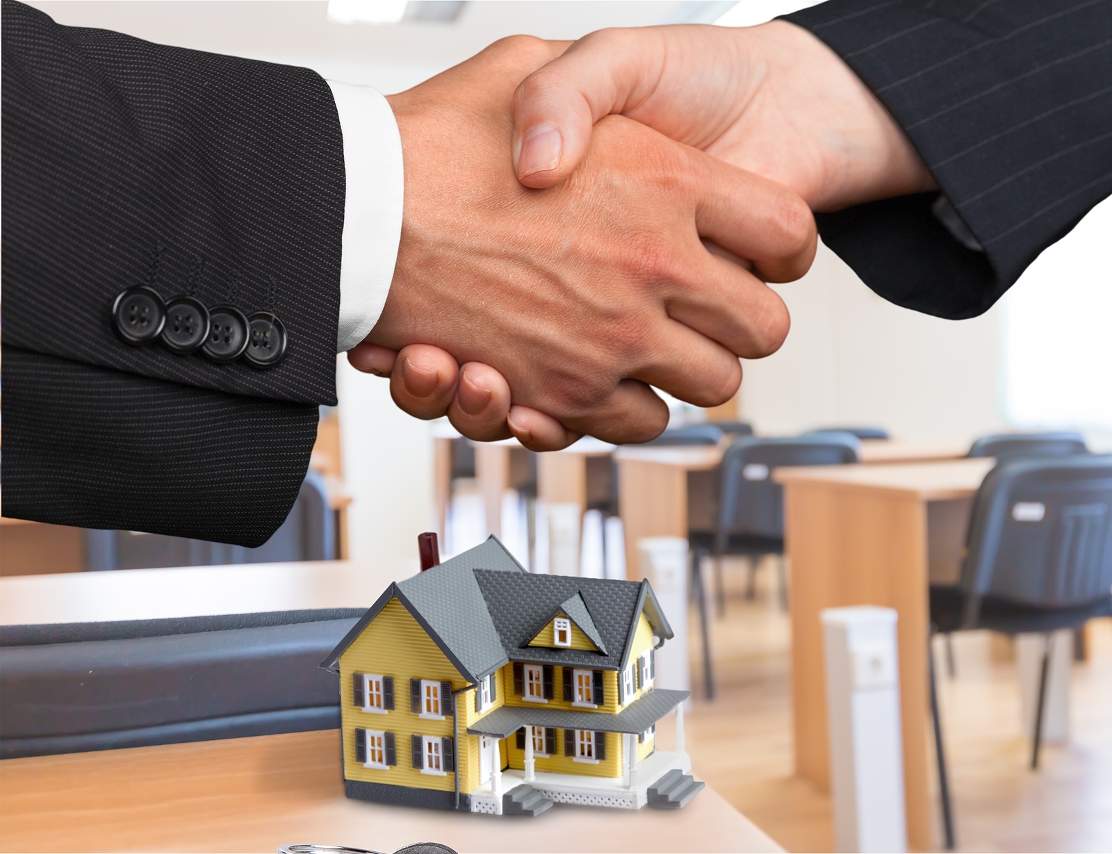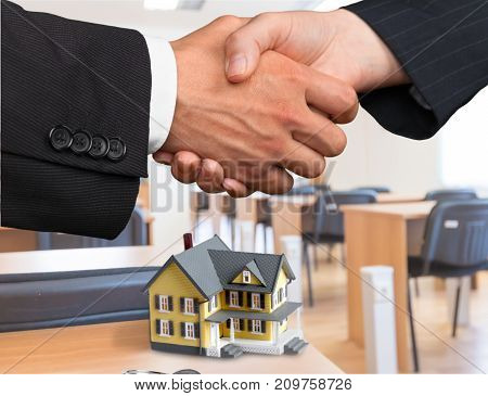 A real estate agent gives the house to a new owner's client after completing the signing of the lease and formally completing home insurance. Rental and insurance concepts.