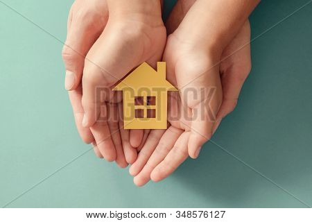 Hands holding yellow paper house on blue background, family home, homeless shelter housing and home protecting insurance, mortgage concept, foster home care